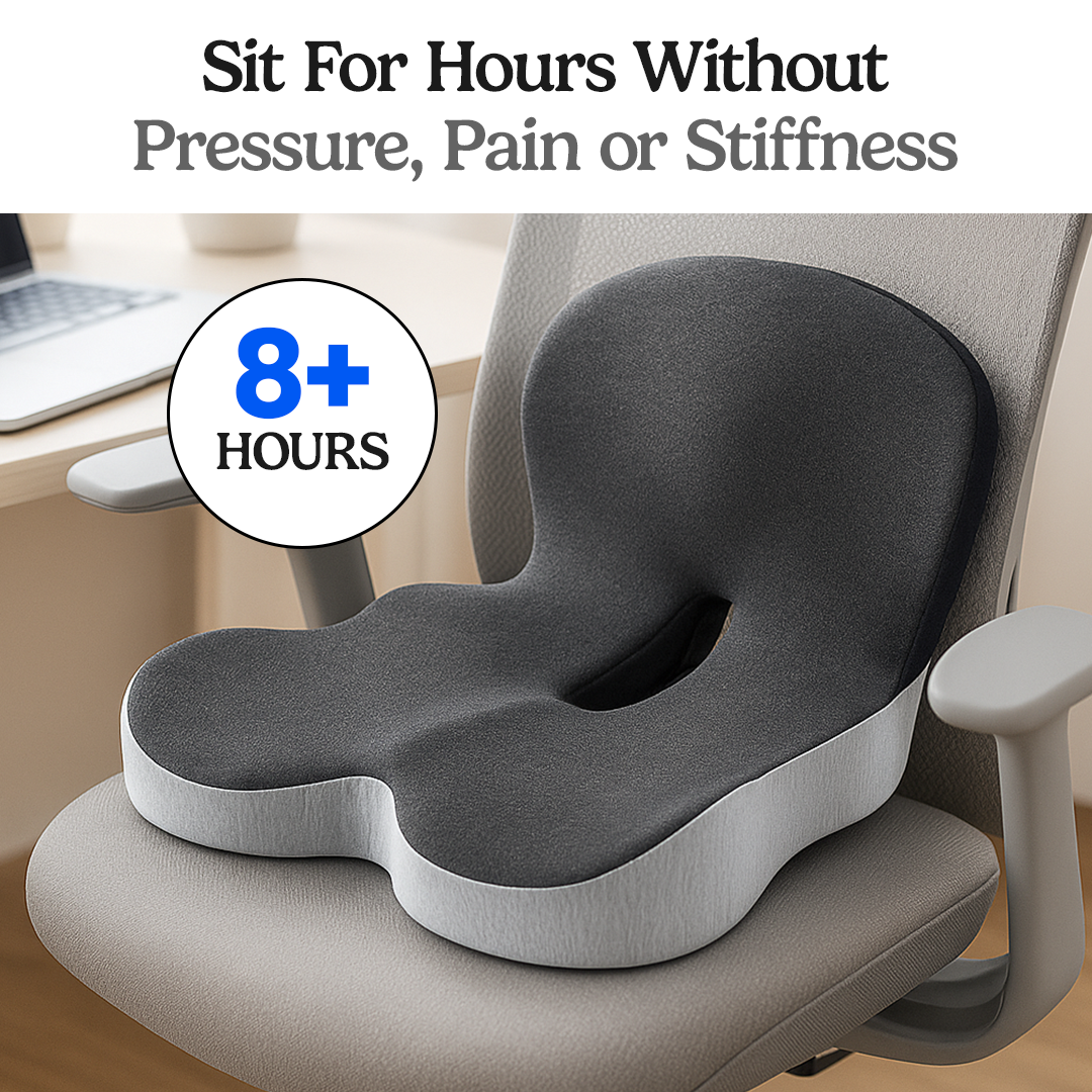 A supportive seat cushion distributes weight evenly, reducing pressure on the hips, tailbone, buttocks, and hamstrings. By promoting proper posture, it eases strain from long hours of sitting and helps prevent lower back and pelvic discomfort.
